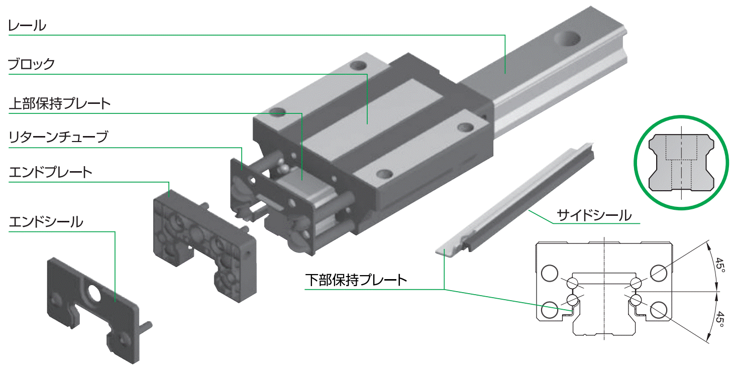 - ステンレス鋼の保持プレットがブロックの上面と底面に組み込まれているため、レールを抜いてもボールは脱落しません。底面保持プレットはサイドシールと一体形に設計されているため、異物のブロック内の侵入を防止します。