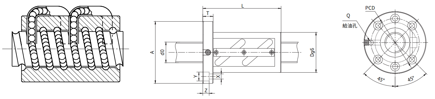 | do | Ph | DW | 列×巻 | KN | KN | N/μm | D1 | D4(g6) | L | T | X×Y×Z | PCD | Q | dxf | IGES | STEP | ||