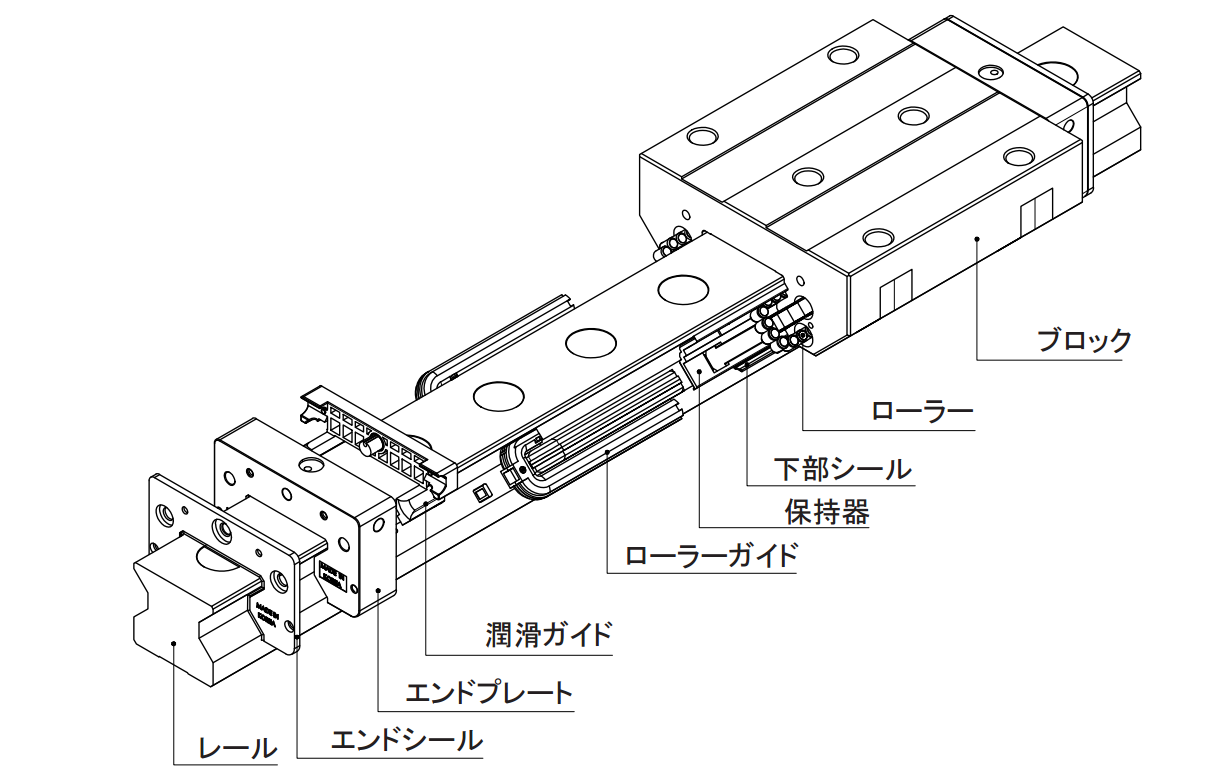 - ローラーがレール全長に渡り、均一の予圧を保つよう、ローラーの直径、長さ、形状を最適化しているため、高荷重・高精度・長寿命が得られます。